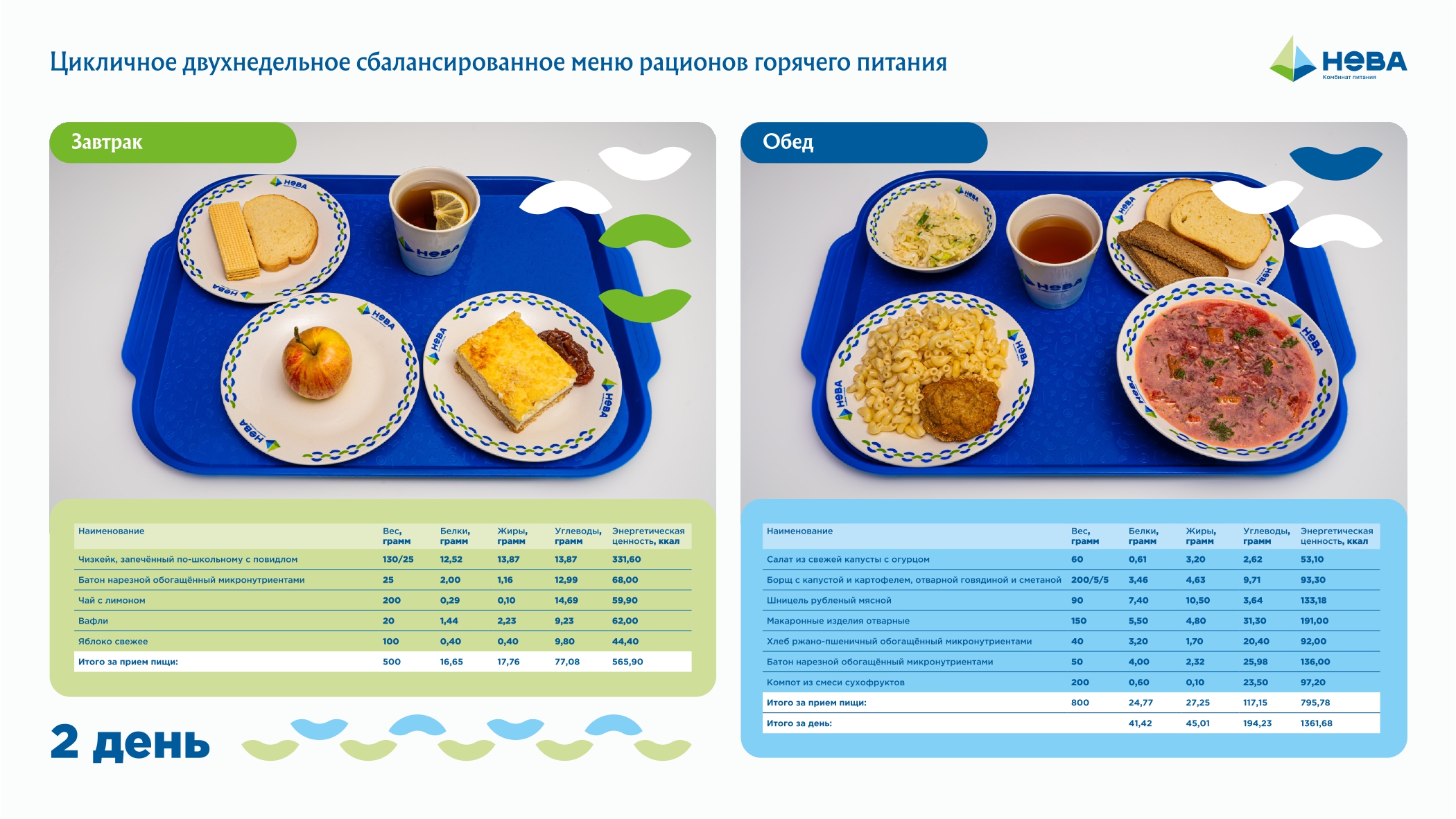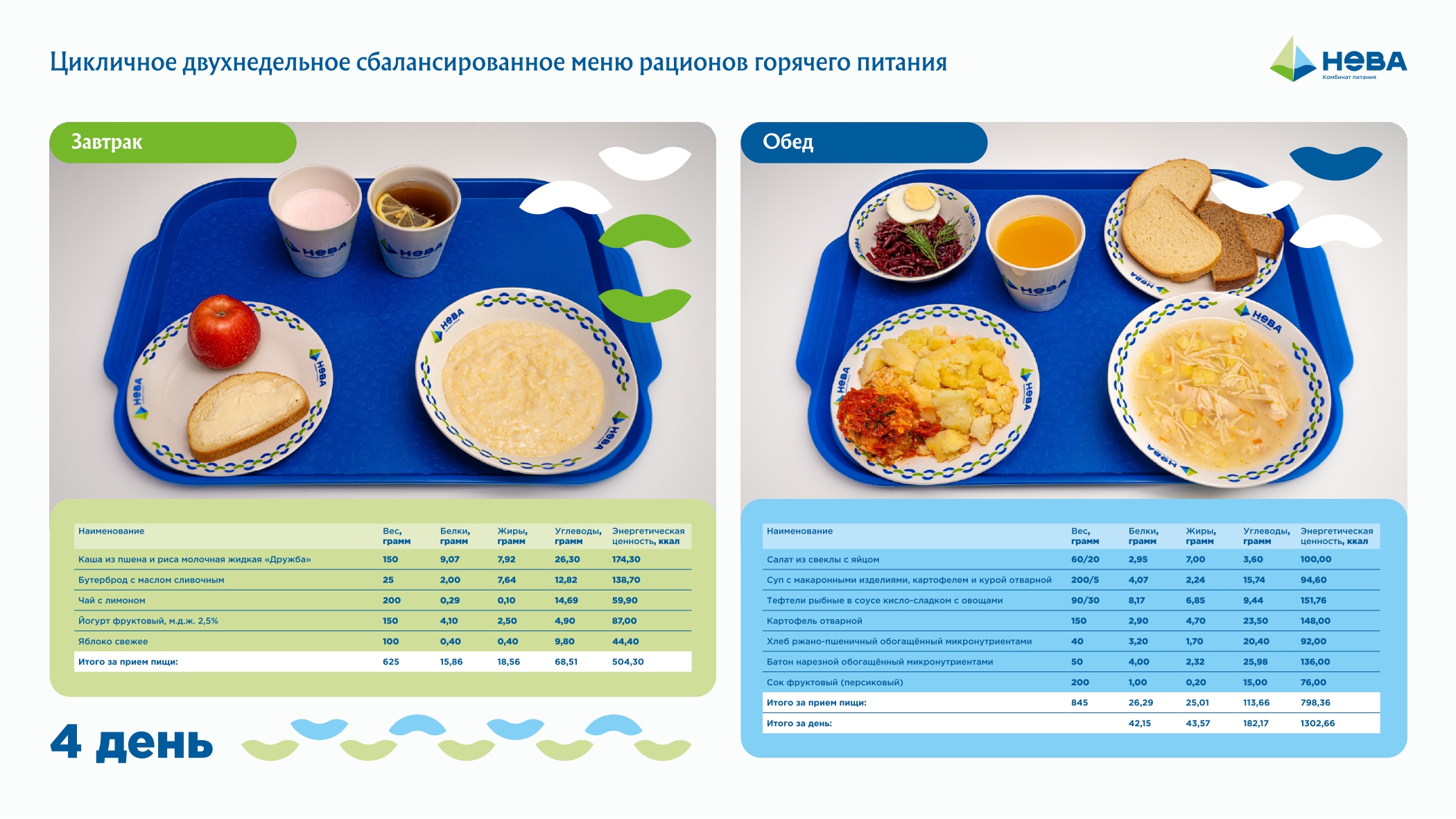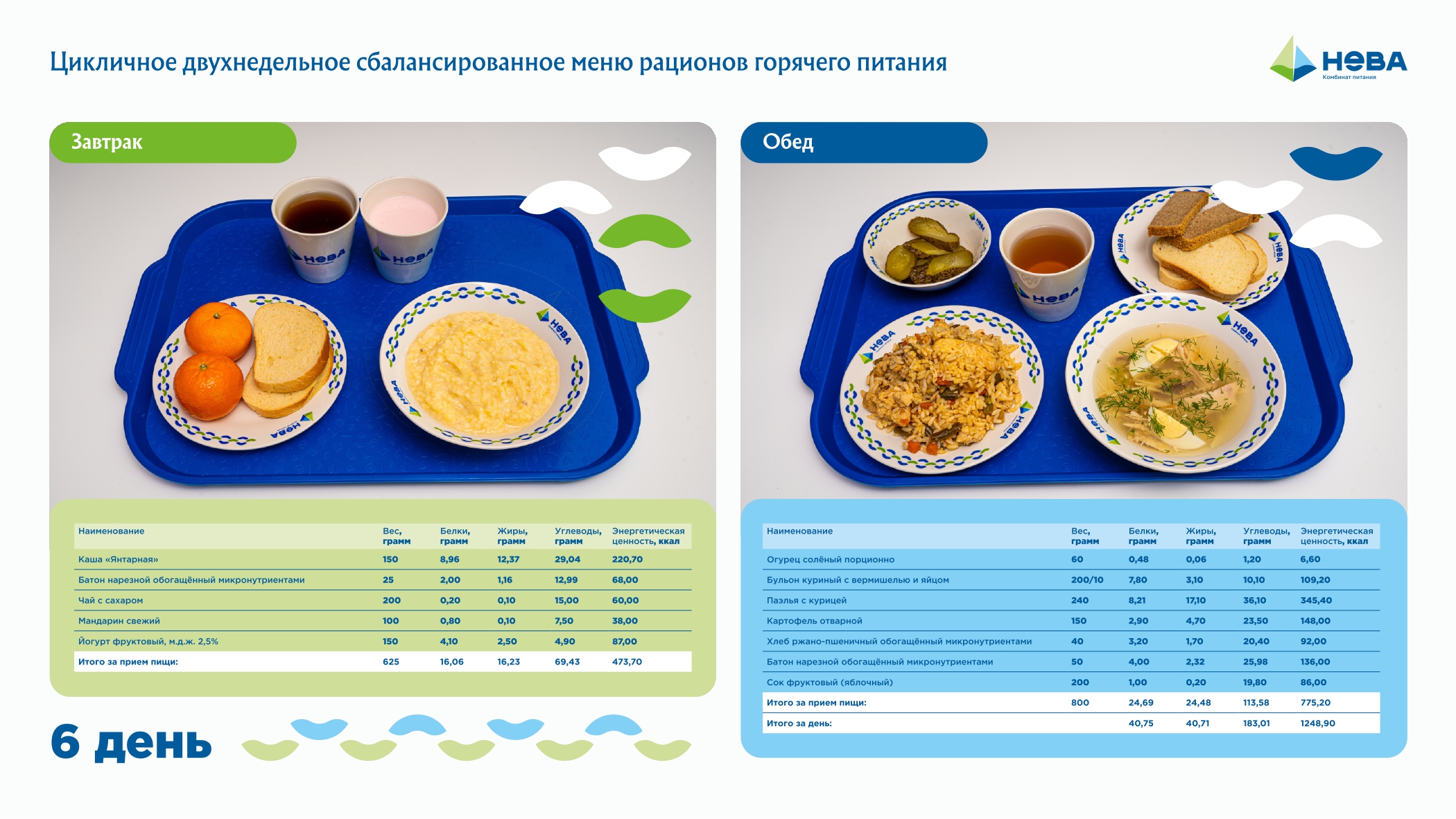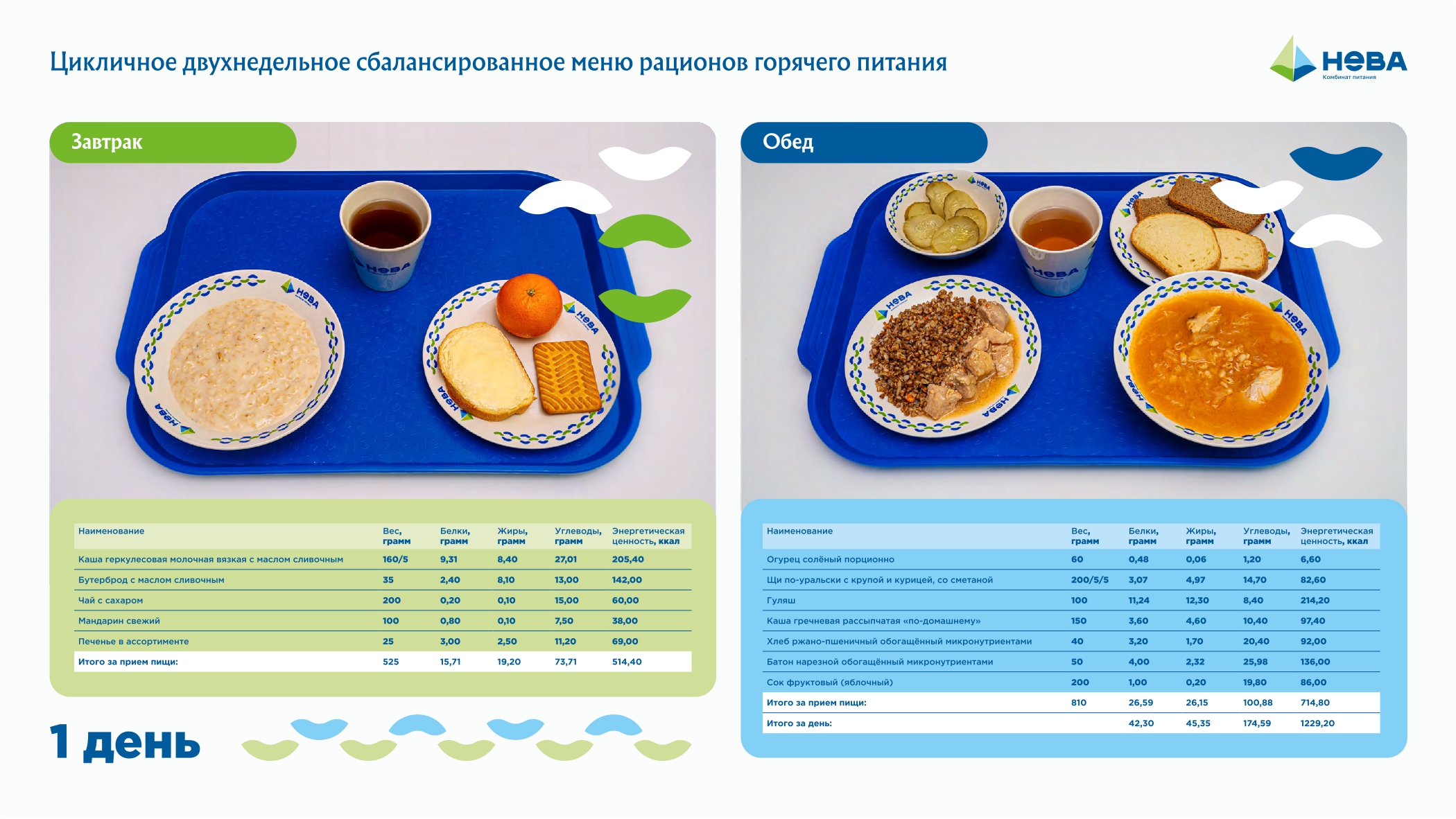 Организацию питания и обслуживание столовой осуществляет АО «Комбинат питания «НЕВА»». Директор Филиппов С.Н.