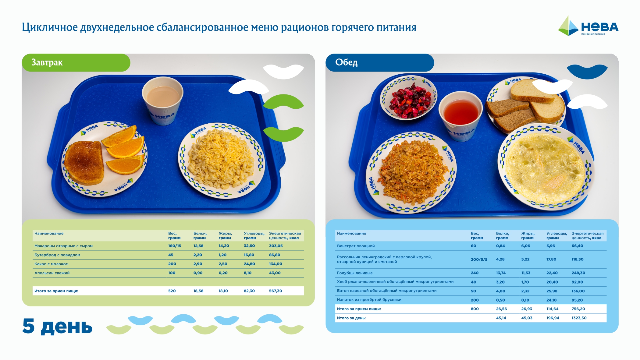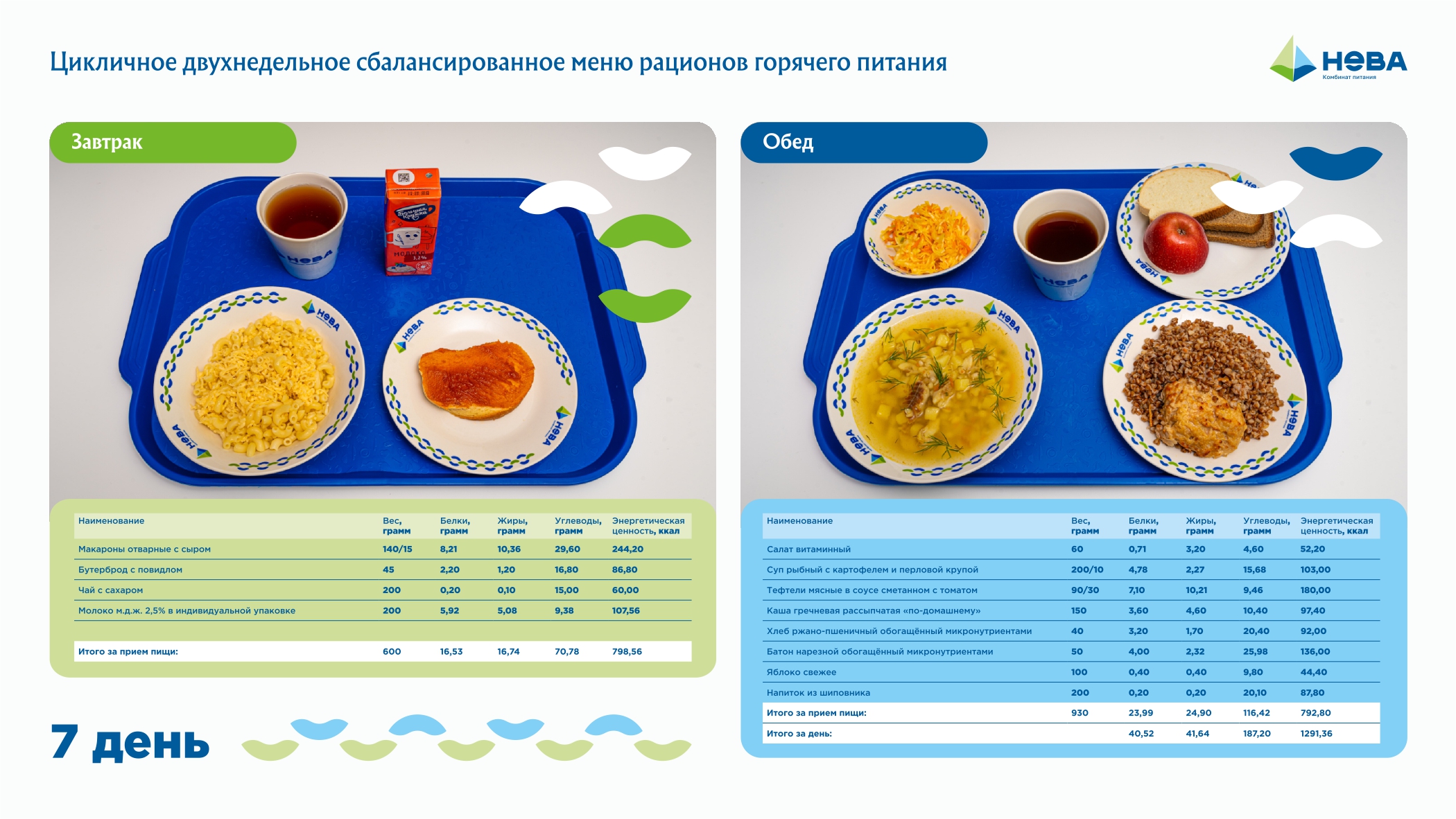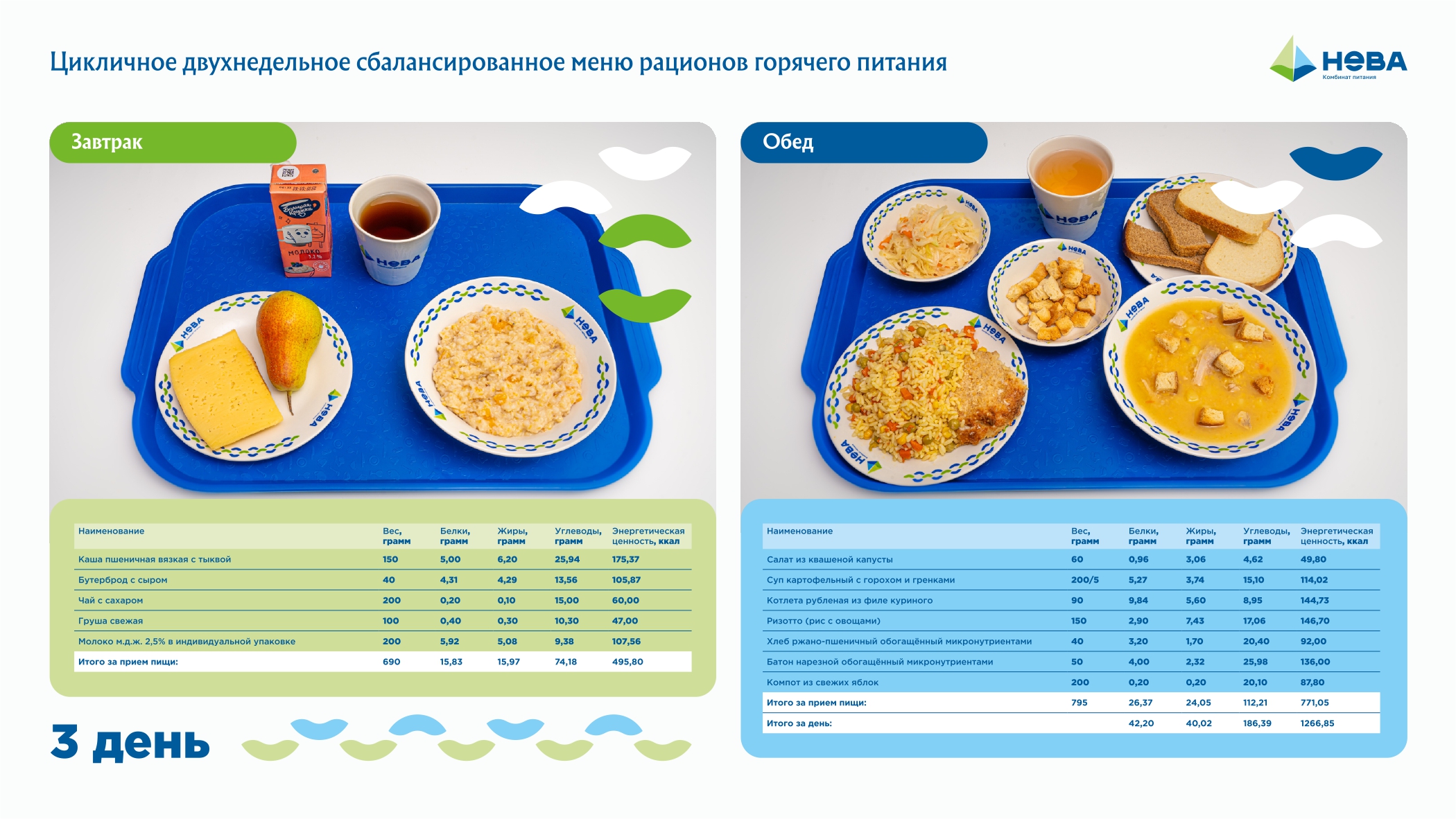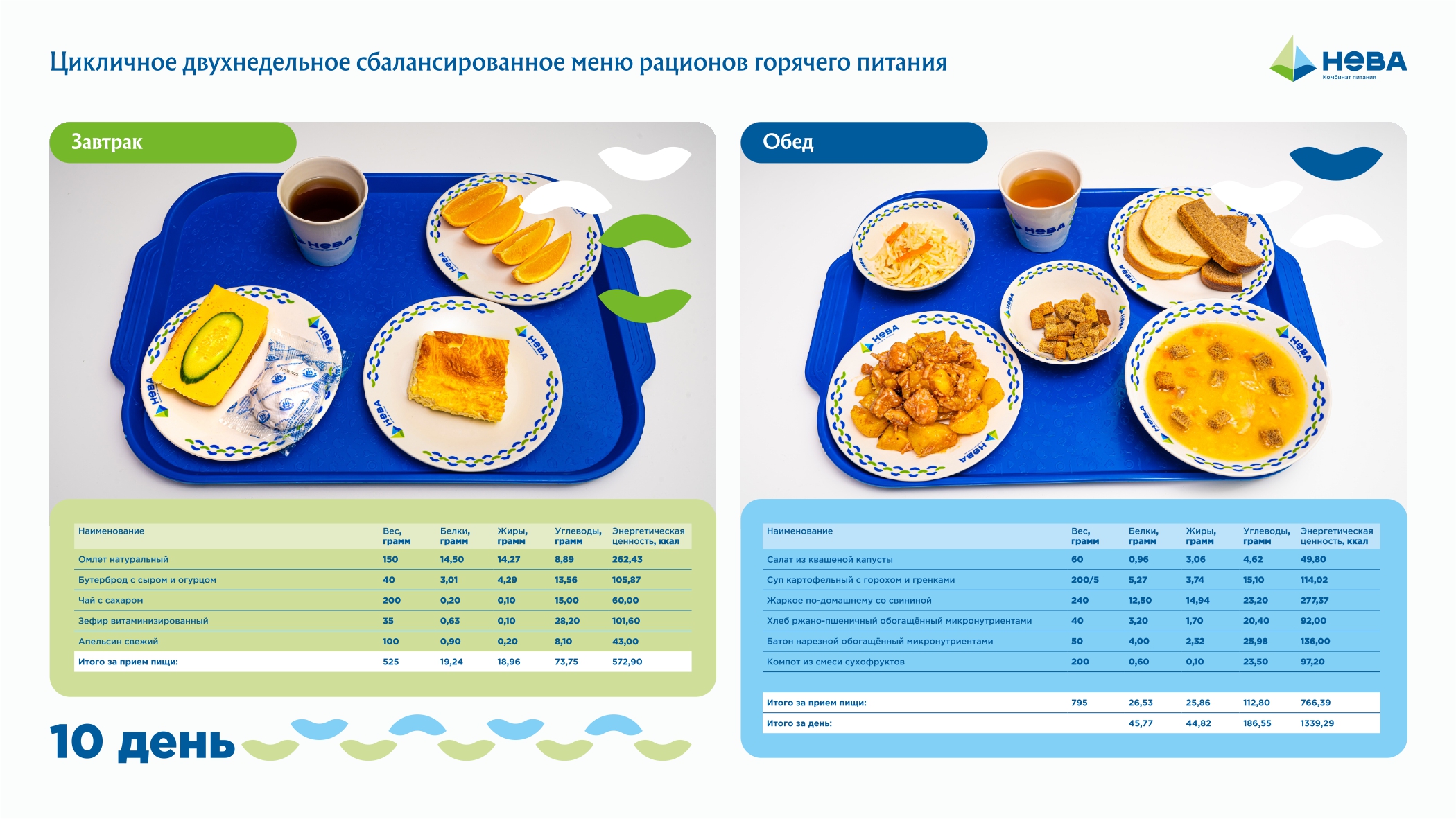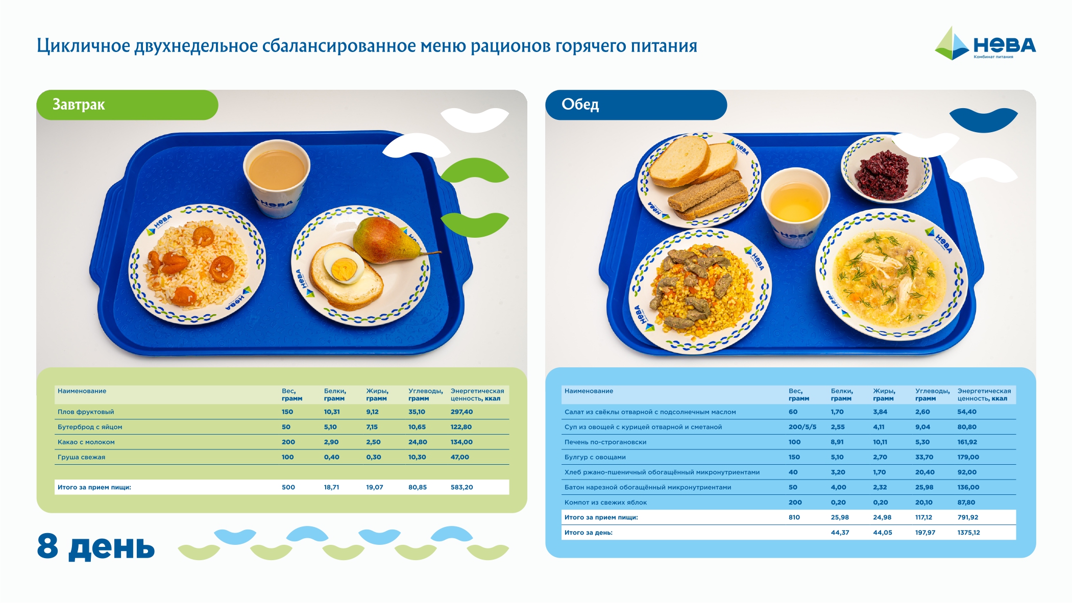 Организацию питания и обслуживание столовой осуществляет АО «Комбинат питания «НЕВА»». Директор Филиппов С.Н.